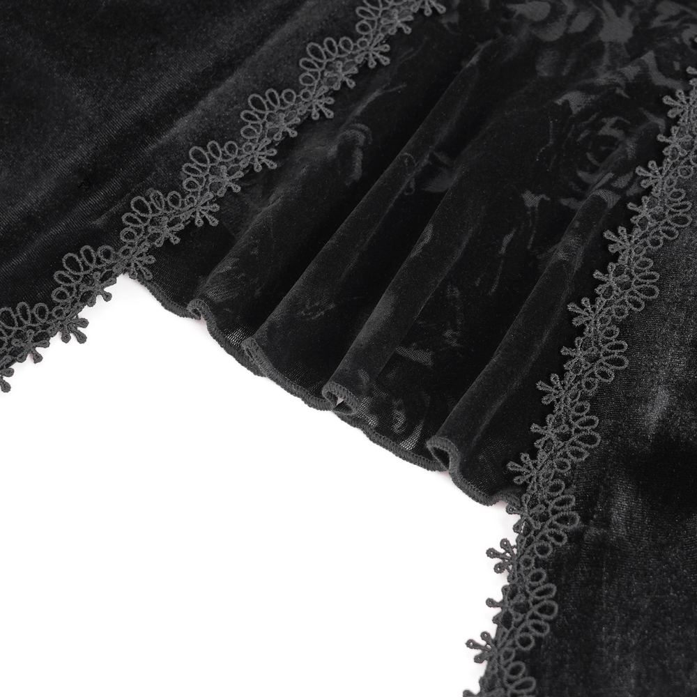 Black off-shoulder lace dress with high-low hem and intricate detailing, perfect for gothic and romantic occasions.