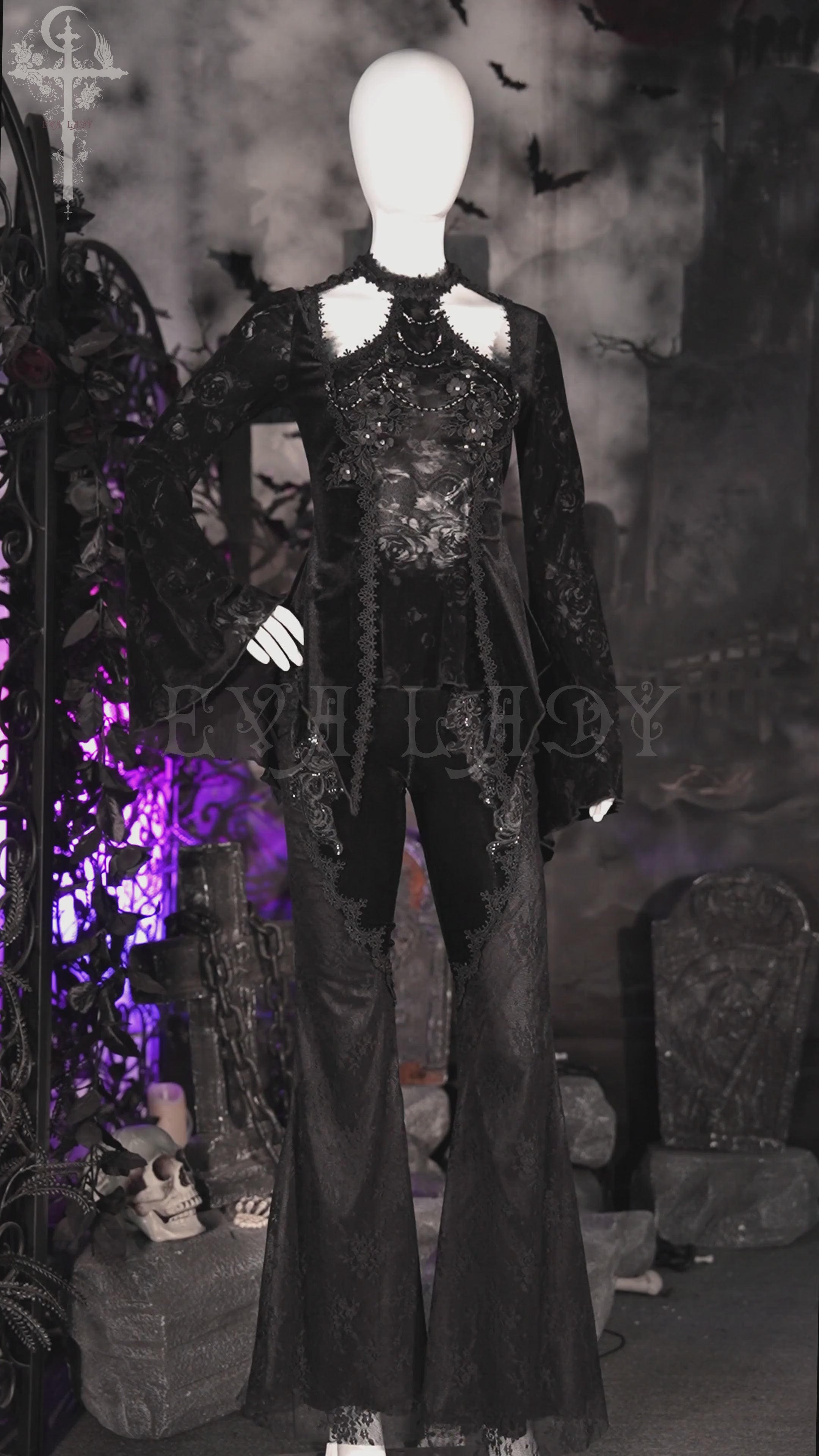 Elegant black lace dress with flowing sleeves and a fitted bodice, showcasing a stylish, gothic-inspired look.