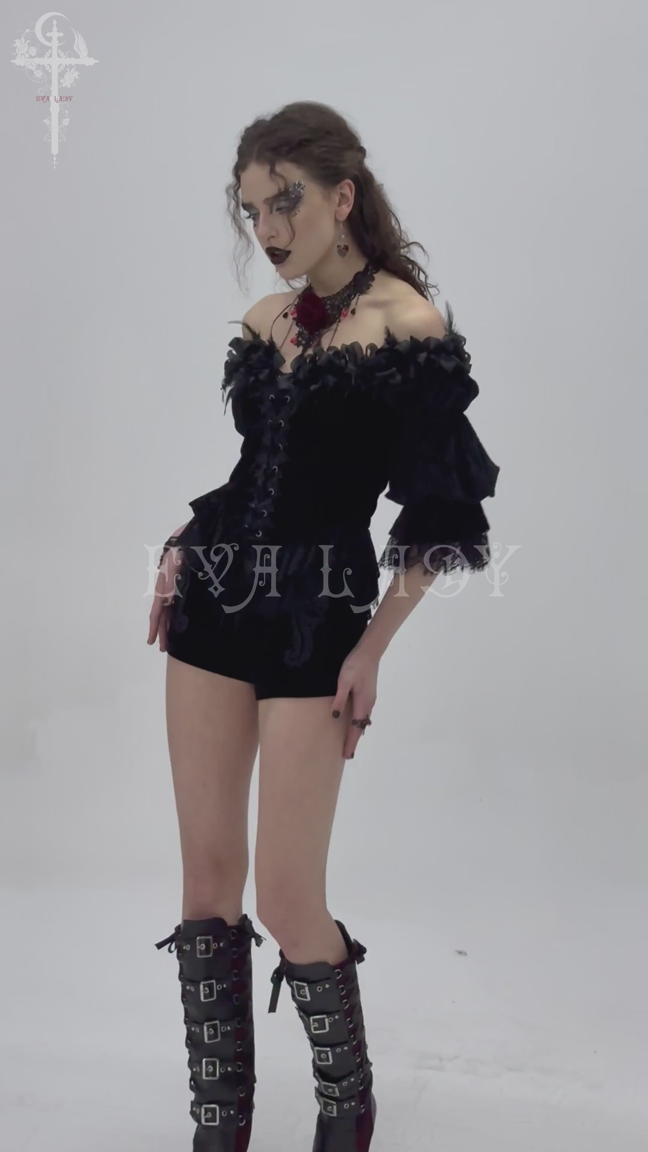 Blouse en velours à épaules dénudées avec dentelle gothique et roses Aller au contenu