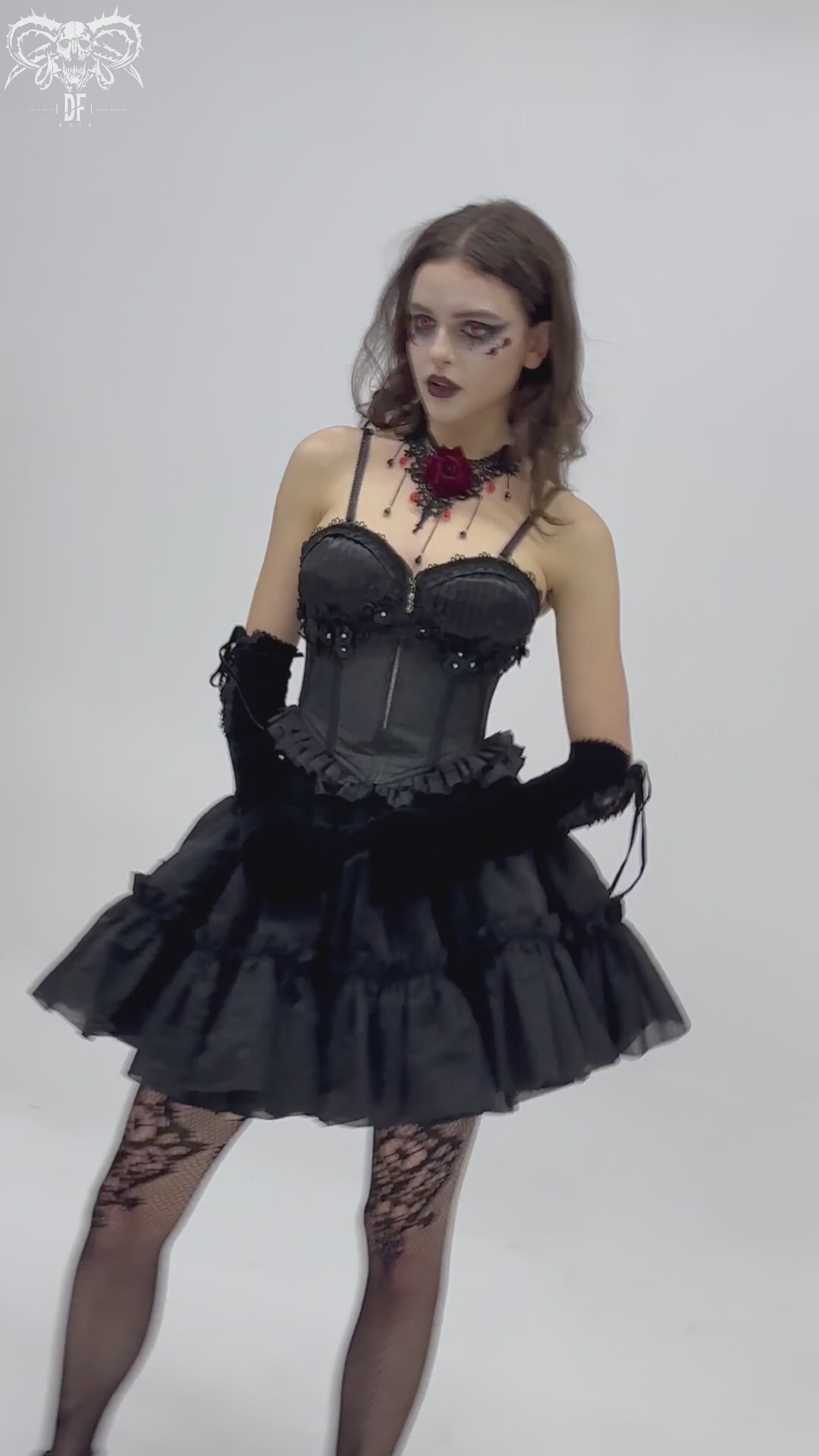 Corset noir à lacets orné de fleurs avec détail à volants Aller au contenu