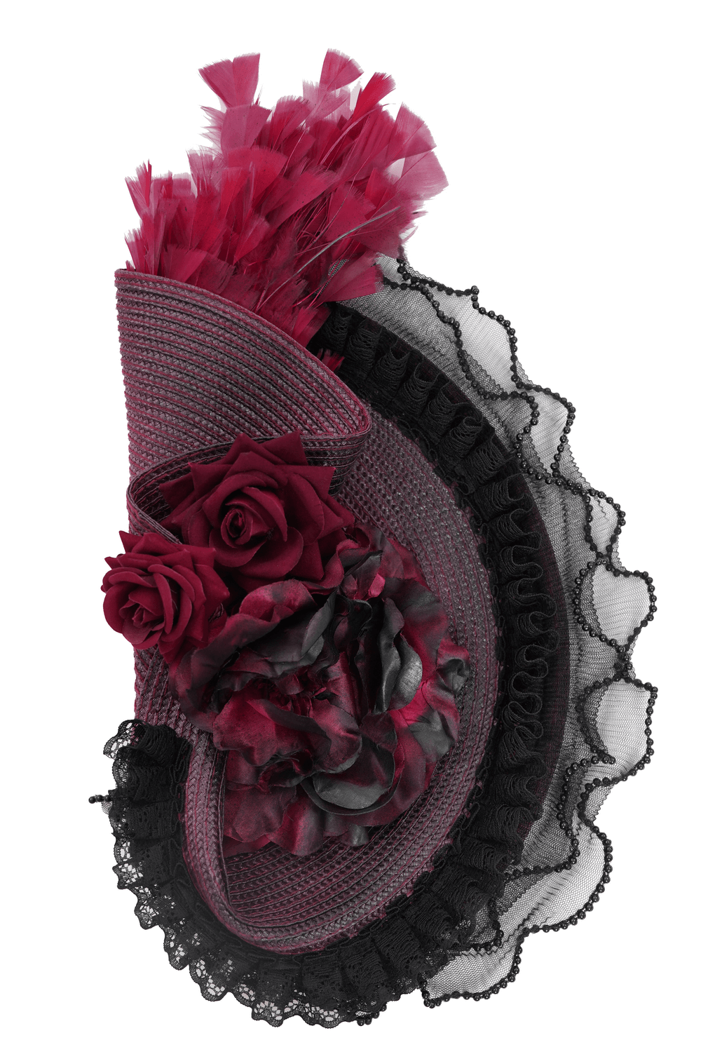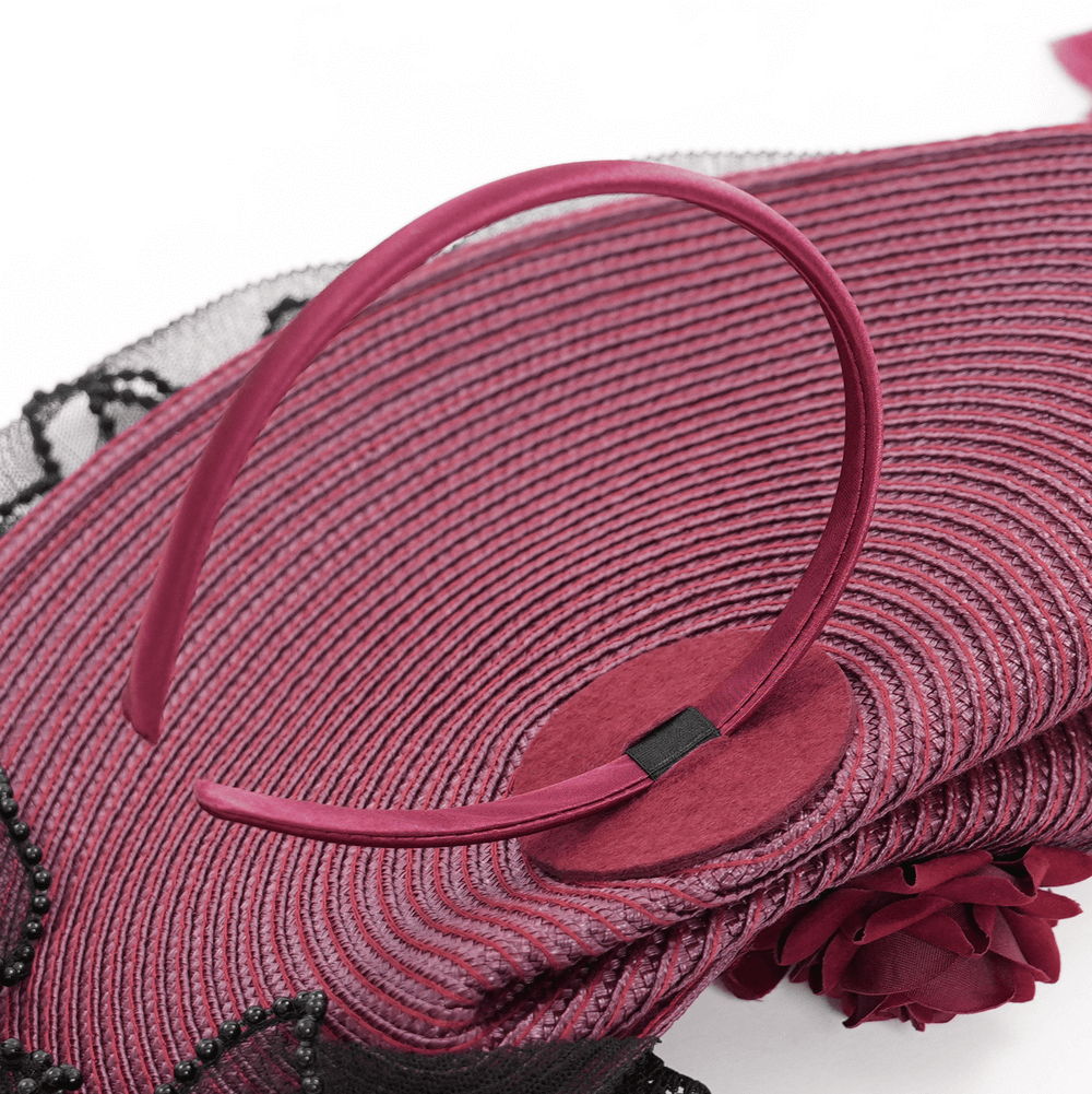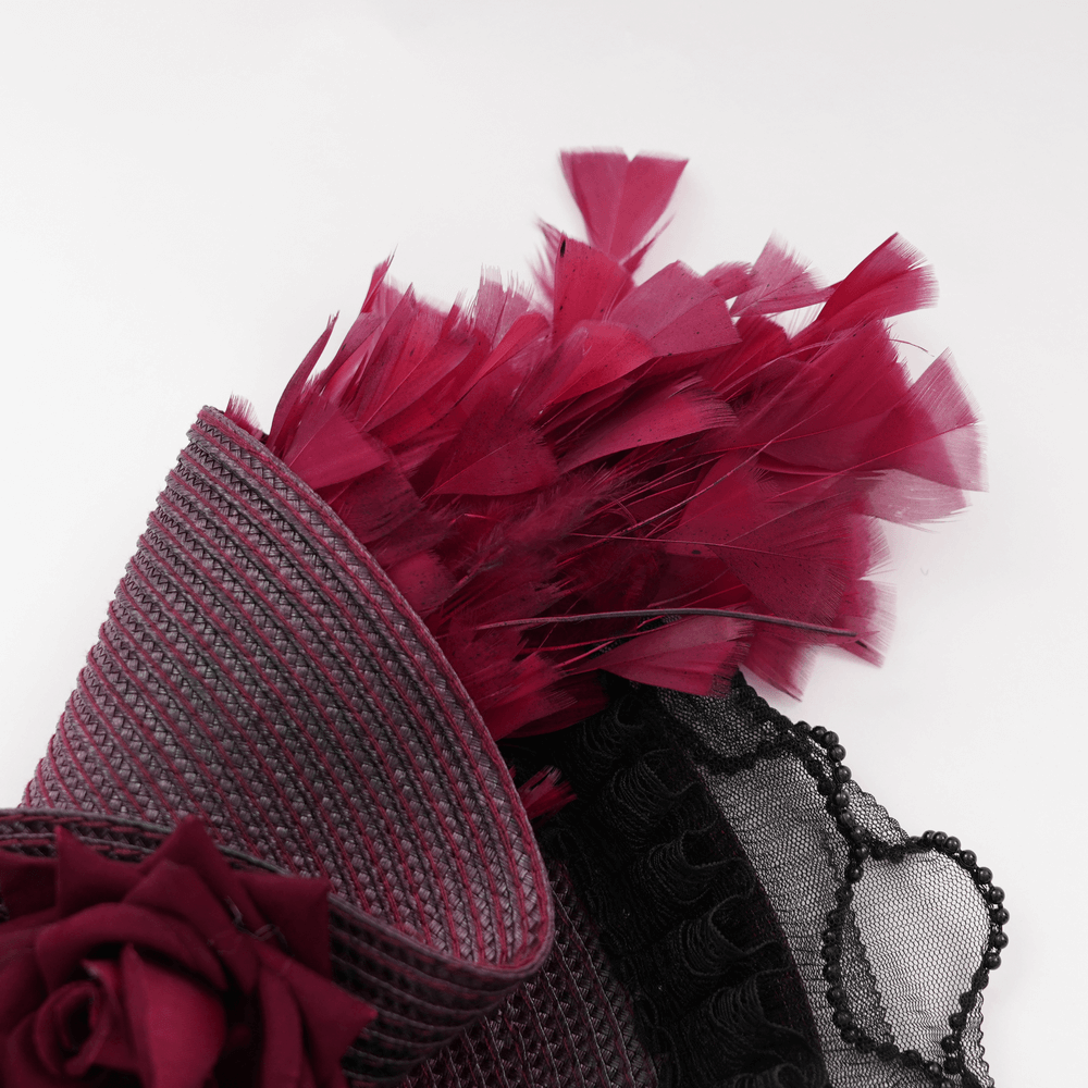 Ce fascinant élégant bordeaux et noir est parfait pour ajouter une touche dramatique à votre look. Doté de délicats détails en dentelle, de riches roses bordeaux et de plumes dramatiques, il est idéal pour les mariages, les événements gothiques ou les thés. Le savoir-faire raffiné et le charme vintage de cet accessoire en font un élément inoubliable pour toute occasion spéciale.