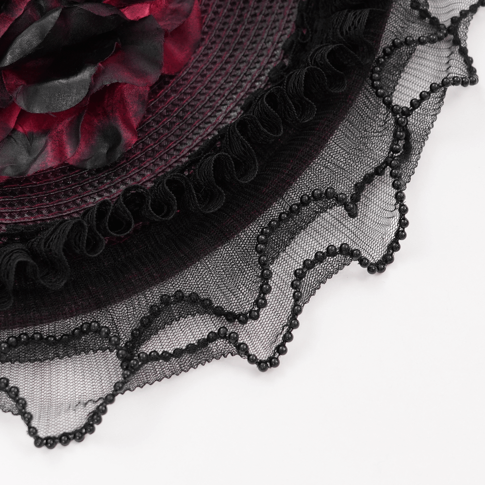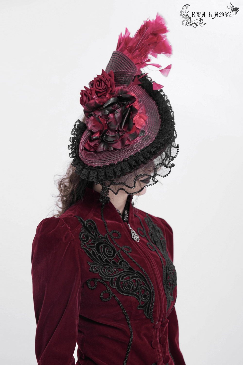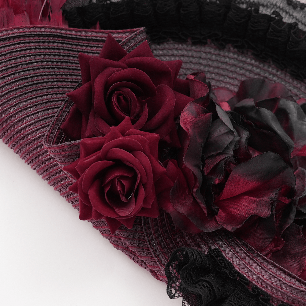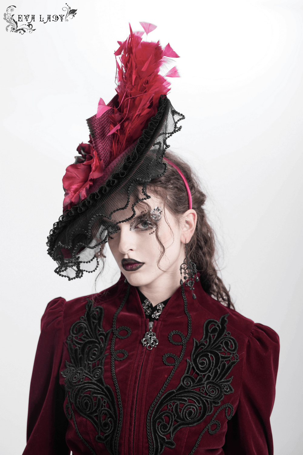 Ce fascinant élégant bordeaux et noir est parfait pour ajouter une touche dramatique à votre look. Doté de délicats détails en dentelle, de riches roses bordeaux et de plumes dramatiques, il est idéal pour les mariages, les événements gothiques ou les thés. Le savoir-faire raffiné et le charme vintage de cet accessoire en font un élément inoubliable pour toute occasion spéciale.