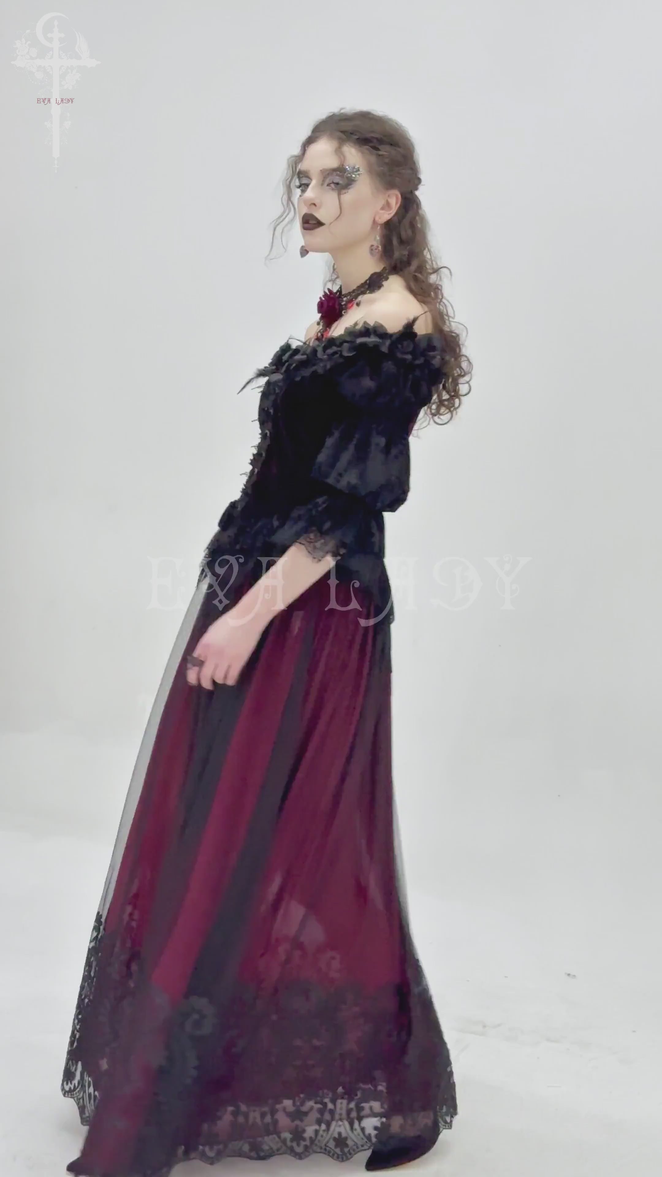 Dark romance lace off-shoulder high-low gothic dress with intricate details and dramatic hem for an enchanting look.