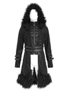 This gothic long coat features a dramatic hood, faux fur trim, and textured fabric with multiple straps and buckle accents. Designed with a close-fitting silhouette and full-length shape, it blends synthetic leather and soft materials for an alternative style. Ideal for cosplay, dark fashion outfits, and winter streetwear looks.