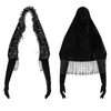 This gothic black velvet cape features beautiful floral rose detailing along the hood and luxurious velvet sleeves. The cape is adorned with fringed detailing at the bottom for a dramatic touch. Perfect for adding an elegant, vintage-inspired flair to your outfit, it is ideal for evening events or special occasions. This accessory combines classic gothic style with modern chic elements.