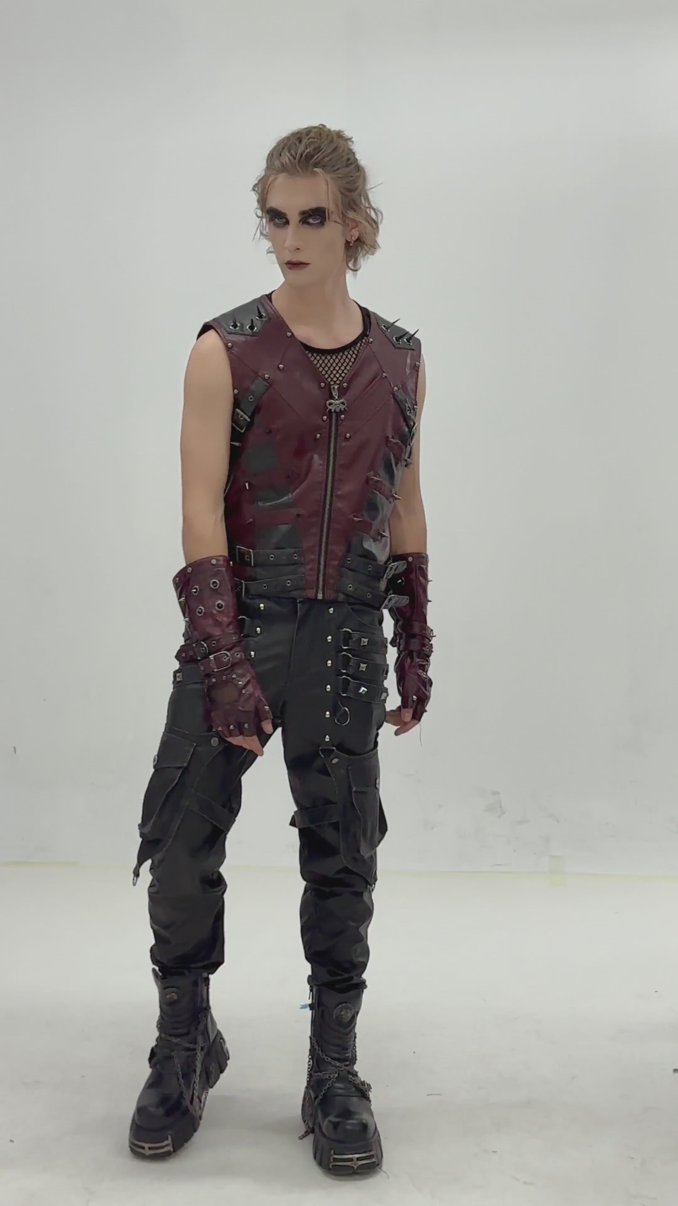 Introducing our latest addition to your punk wardrobe essentials: these maroon leather gauntlets feature an array of buckles and metal studs, perfect for adding an edge to any outfit. Designed for the fashion-forward individual, these arm bracers combine style and a bold statement. Ideal for festivals, concerts, and themed parties.